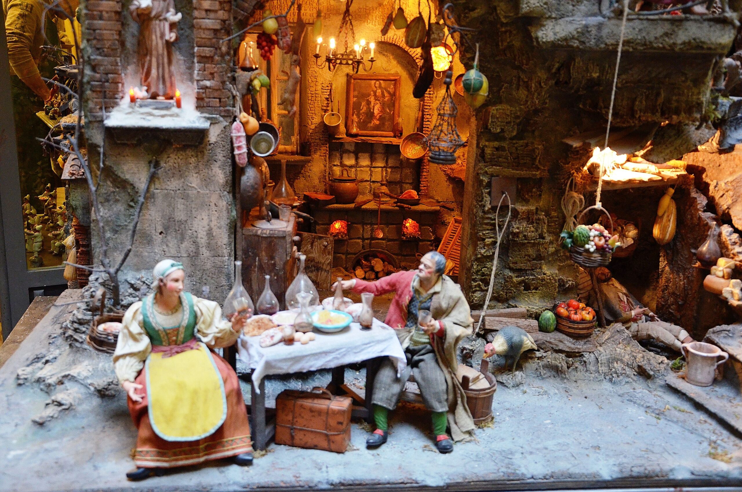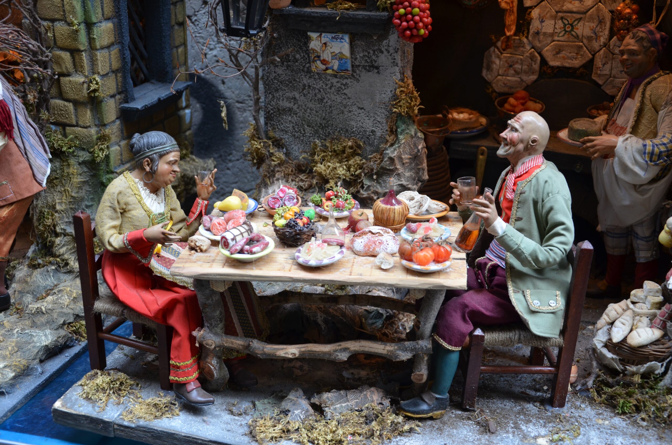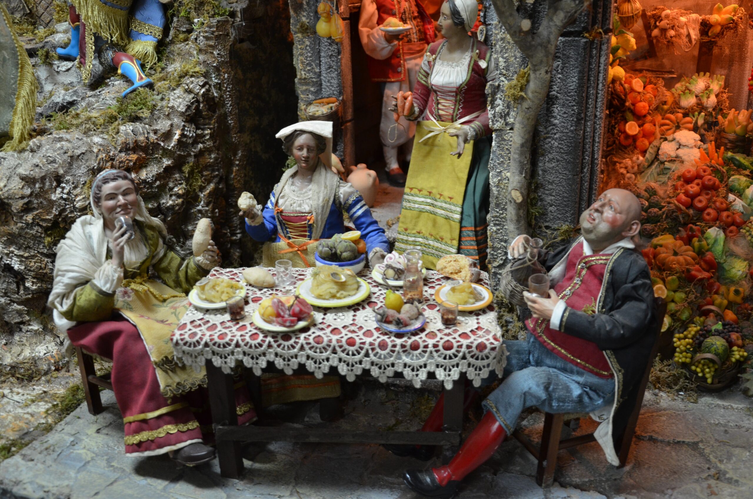 Ed ecco apparire la taverna, l’osteria, le bancarelle di frutta, e personaggi come l’oste, il pescatore, il macellaio e molti altri. La Nascita del Salvatore inserita in un contesto di vita che non può mancare gli appuntamenti con il cibo.