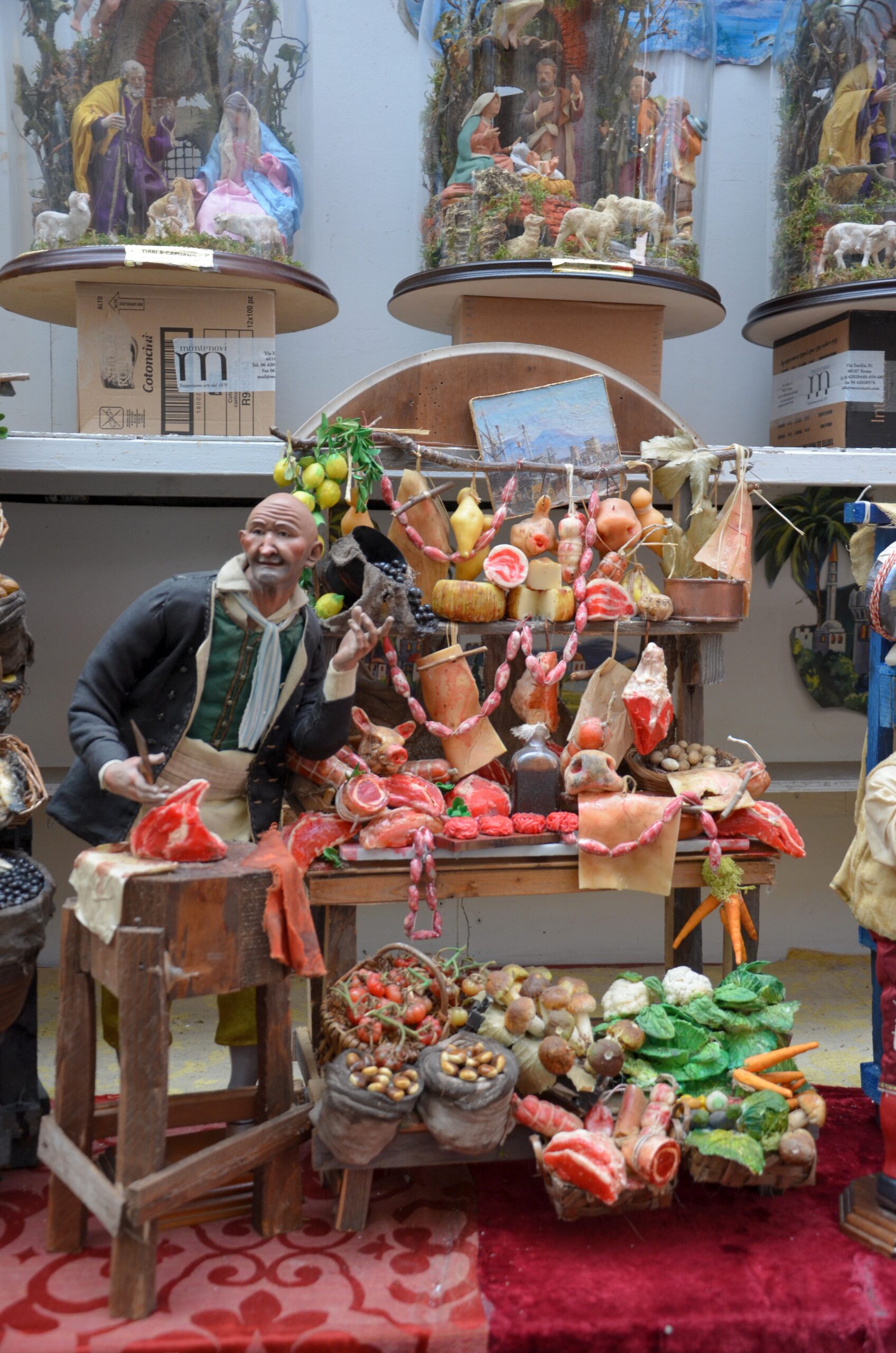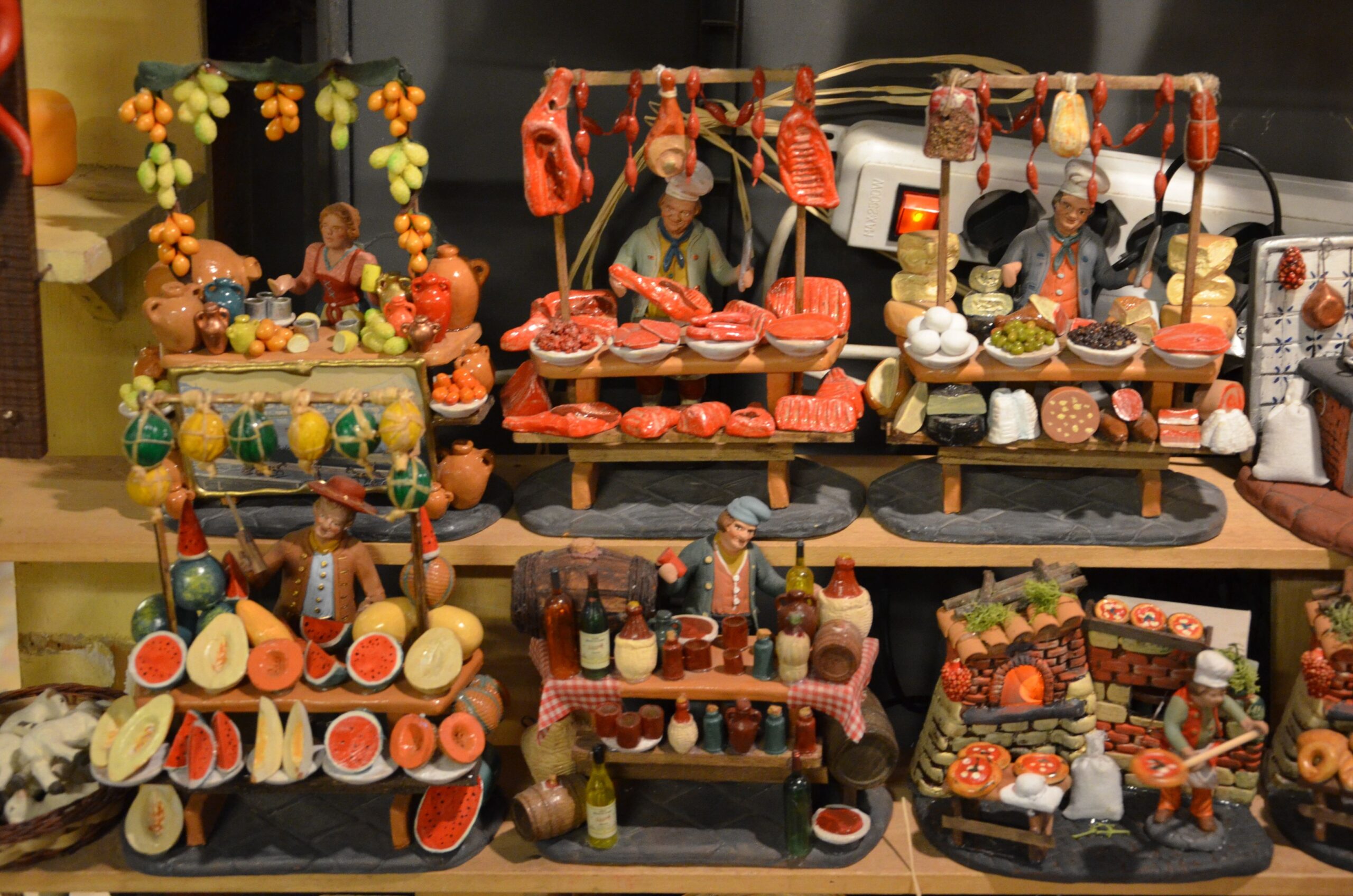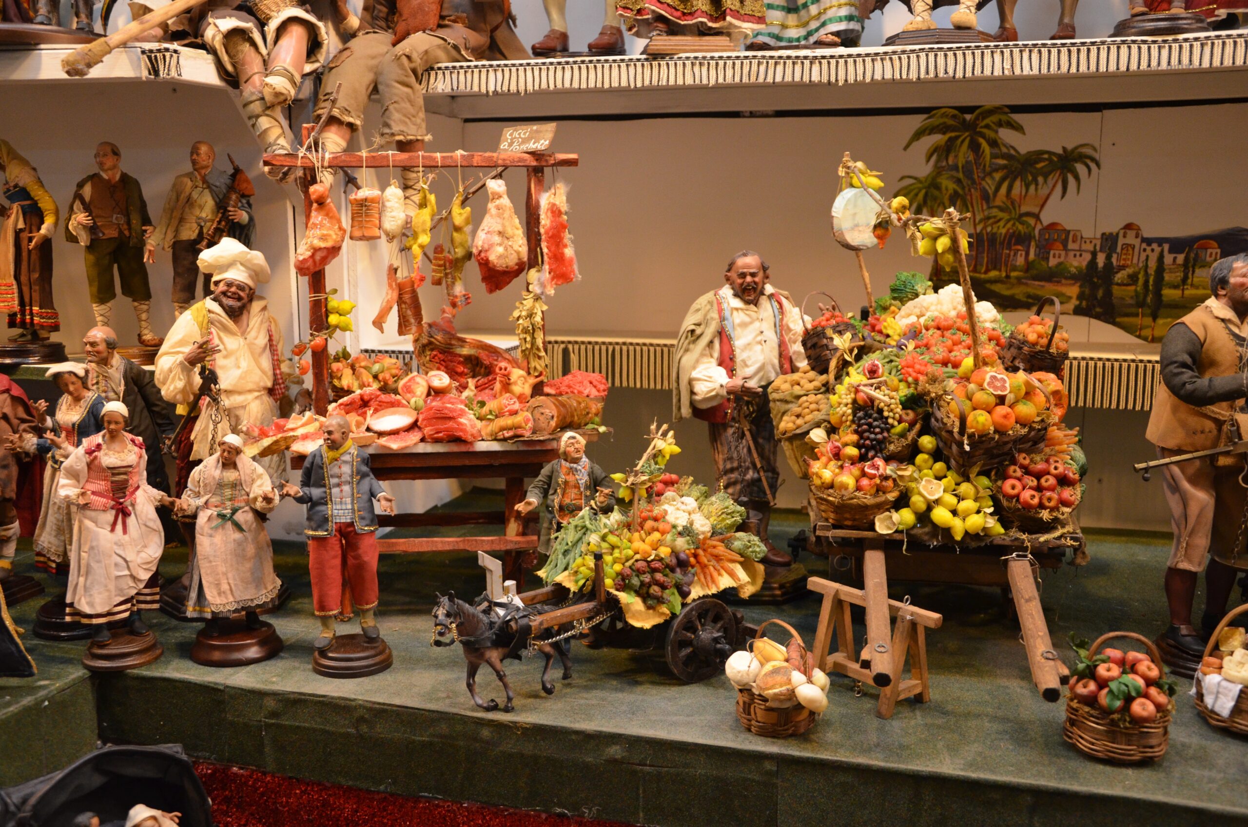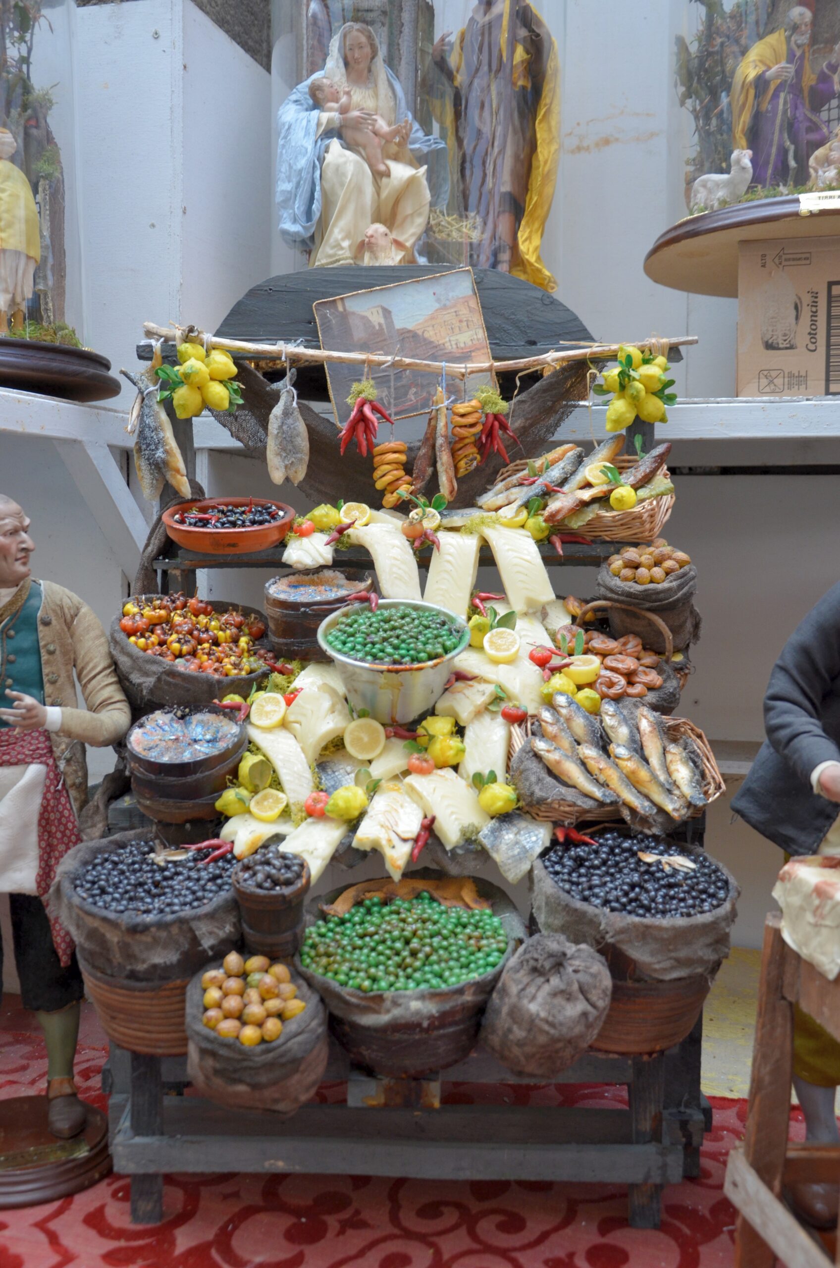 Ed ecco apparire la taverna, l’osteria, le bancarelle di frutta, e personaggi come l’oste, il pescatore, il macellaio e molti altri. La Nascita del Salvatore inserita in un contesto di vita che non può mancare gli appuntamenti con il cibo.