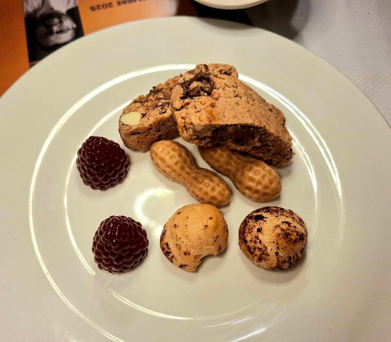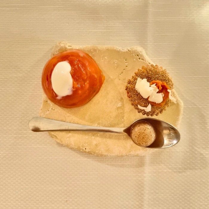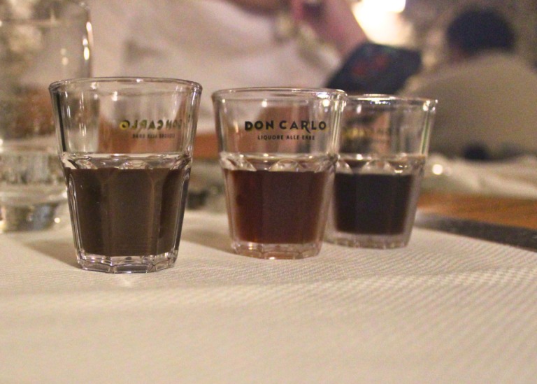 In apertura, tra gli amuse-bouche, Don Carlo in un sol boccone, una sfera di gelatina di Amaro Don Carlo.